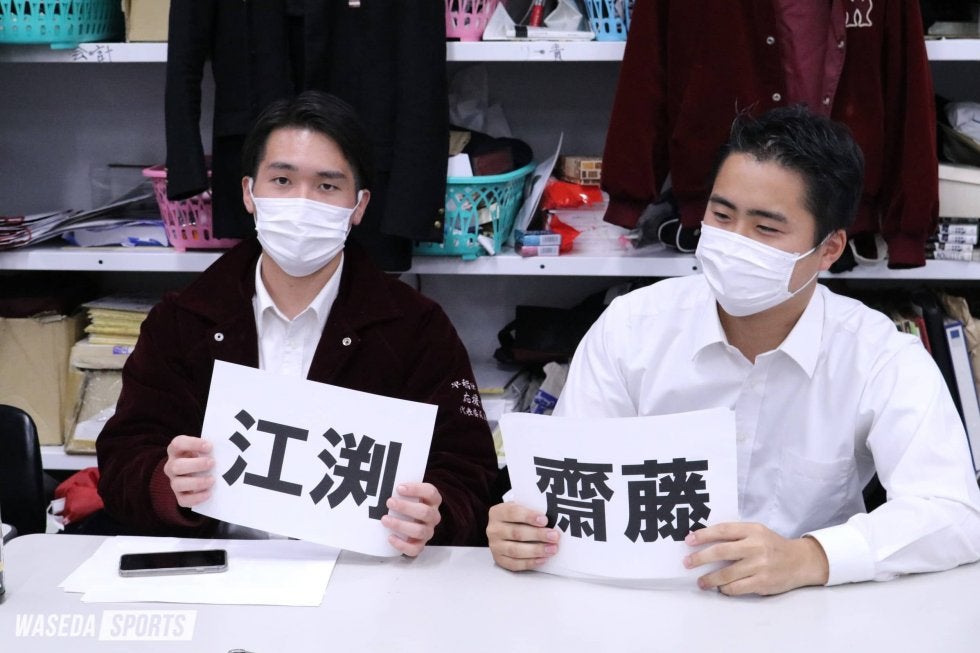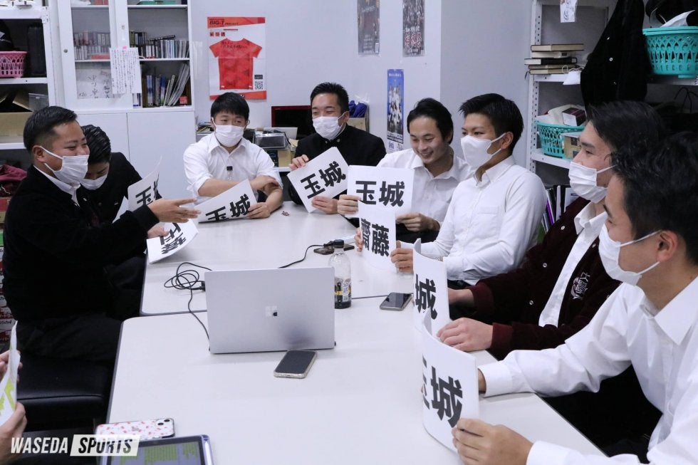 第三回より開幕した「目玉企画 リーダー執行委員番付」。令和4年度リーダー執行委員・齋藤巽前代表委員主将(教4=青森)、江渕太朗前代表委員主務(文4=東京・海城)、井上皓介前副将兼旗手(法4=東京・早大学院)、西田健太朗前新人監督(教4=愛媛・愛光)、小林昭雄前リーダー会計責任者(社4=東京・早実)、梶野優介前連盟常任委員兼記録編集責任者(創理4=東京・早大学院)、玉城大基前学生誘導対策責任者(基理4=沖縄・昭和薬科大付)、木部昌平前応援企画責任者兼稲穂祭実行委員長(教4=埼玉・昌平)、入鹿山航也前広報責任者(国教4=東京・早実)、髙橋幸太前リーダー練習責任者(教4=茨城・竜ヶ崎一)の10名が一堂に集結する中、残る6つの番付で1位に輝く者は――。