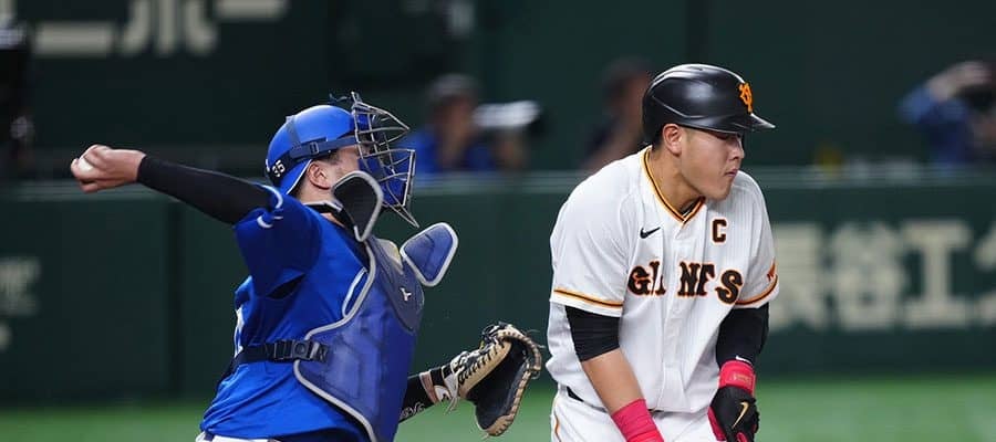 8回、巨人の攻撃は1死一塁で打席に岡本和真内野手。中日の山本拓実投手から粘りに粘り、フルカウントから14球目の外角カーブを見逃して一塁へ歩こうとした。ところが審判の判定はストライク。一塁走者が二塁に走ったのを見た木下拓哉捕手は送球しようとしたものの、岡本和にボールをぶつけそうになったところで腕を振るのを止めている。