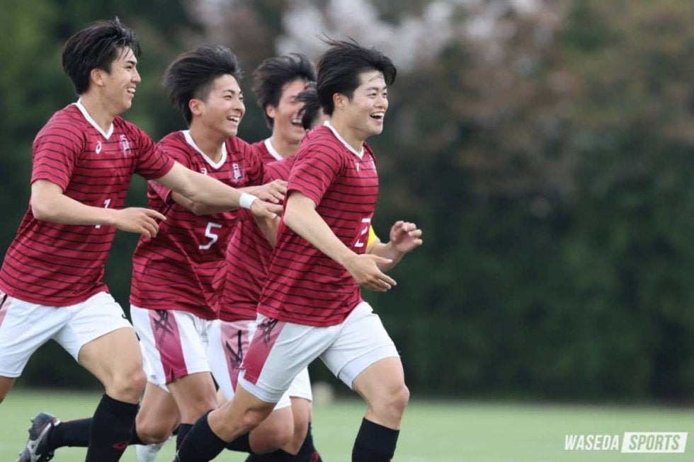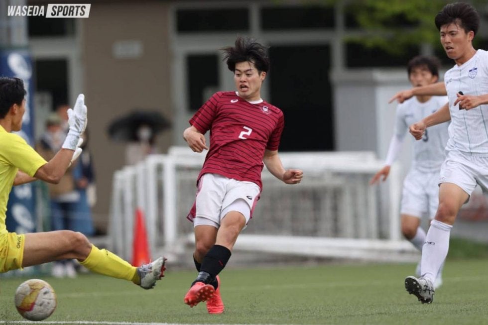 前半立ち上がりは立大のセットプレーからペースをつかまれるも、GKヒル袈依廉(スポ3=鹿児島城西)の好セーブにより先制点を許さない。24分、MF平野右京(人4=兵庫・滝川)からのパスに安斎が合わせ、シュートを放つ。しかし、相手DFに当たり惜しくも得点とはならなかった。それでもこれを起点に少しずつ早大ペースに持っていく。すると34分、MF平松柚佑主将(社4=山梨学院)のロングパスにFW駒沢直哉(スポ3=ツエーゲン金沢U18)が反応。そのこぼれ球を拾ったDF森璃太(スポ4=川崎フロンターレU18)が、先制点を決め幸先良いスタートを切る。続く44分、フリーキックで相手のハンドからPKを獲得。このPKを駒沢が決め、リードを2点差に広げ、前半を終える。