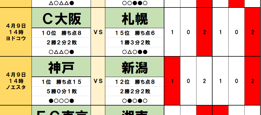 今回のtotoではJ1第7節の8試合とJ2第8節の5試合が対象となっている。過去のデータや直近の様子などから、分析を進…
