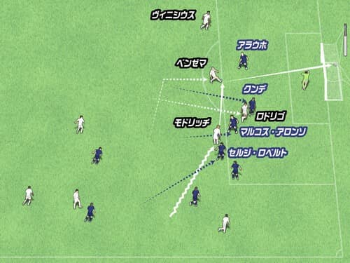 ベンゼマのポジショニングも巧みだった。マークを外したベンゼマは中央へ移動する。その動きと連動するように中央のロドリゴが、マルコス・アロンソの背後へ流れるようにダイアゴナルラン。マークにつくジュール・クンデを引き連れて中央を空けた。