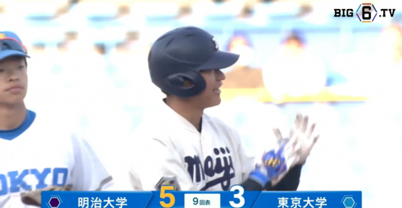 追いつかれた明大は9回表に攻め立て、2死二,三塁とし、
