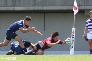 初戦の相手は流通経大。開始早々、前半2分に最初のトライを奪われてしまう。しかし、早大も細矢聖樹(スポ3=國學院栃木)と西浦剛臣(社3=ニュージーランド・ハミルトン・ボーイズ・ハイスクール)らが素早いパスワークでゲインしていく。右に展開し、最後は粟飯原が相手を振り切ってインゴールへ。早速、逆転に成功した。さらに後半4分、相手のディフェンスに絡まれながら、なんとか敵陣22メートルライン付近までパスをつなぐと、金子礼人(法2=福岡・西南学院)がディフェンスのギャップを突きトライを挙げた。しかし、直後の攻撃で流通経大が自陣に入ってくると、早大のディフェンスラインは乱れ、軽々とトライを決められてしまう。最終的にこれが決勝点となり、21-24の3点差で敗北。この結果、1回戦敗者同士が戦うCONSOLATIONトーナメントに進むことが決まった。