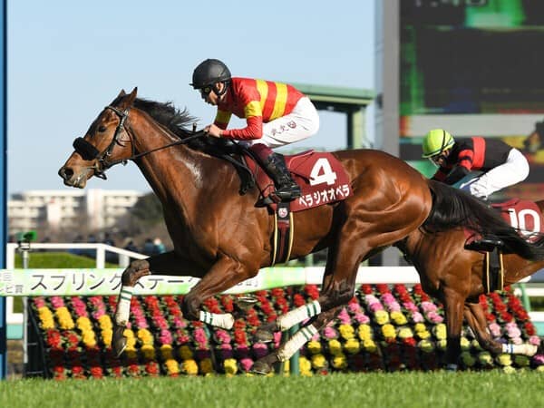ベラジオオペラの戦績を振り返ってみよう。昨年11月の新馬戦(阪神・芝1800m)は、2番手追走からの叩き合いをアタマ差で制して初勝利。続く今年1月のセントポーリア賞(東京・芝1800m)も2番手からゴール前で力強く抜けて押しきり2連勝を飾った。そして前走のGⅡスプリングS(中山・芝1800m)では、道中7番手から脚をためて差し脚を伸ばし、2着に1馬身1/4差をつけて完勝している。