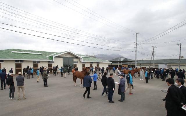 日高育成牧場での展示会は午前9時より、まず全体を6班に分けての比較展示からスタートした。天候は薄曇りで比較的暖かく、この時期としては過ごしやすい気候に恵まれて、開始時間になると、調教師や各地から集まった育成馬の生産者などが、名簿を片手に1頭ずつ成長した2歳馬たちを熱心に見て回った。