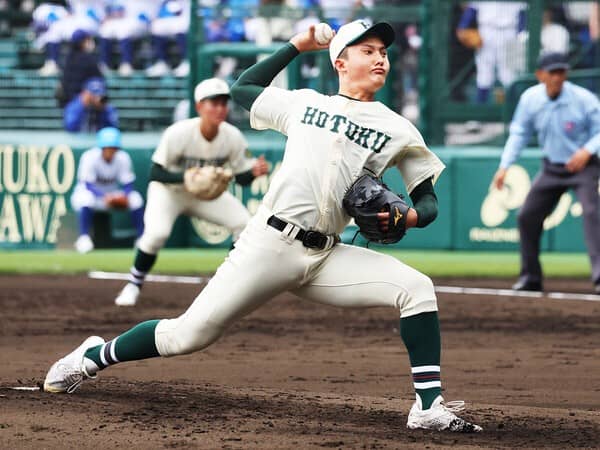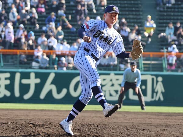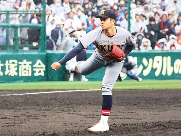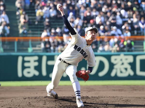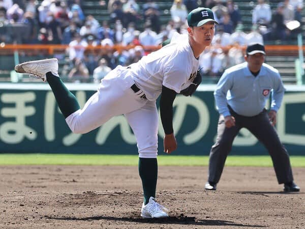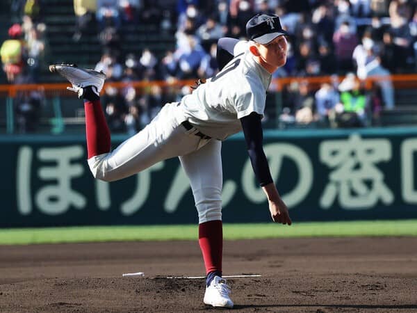 下級生時から絶賛してきた投手です。今春の甲子園で無双状態になるのでは......と予想していましたが、ライバルチームの奮闘もあって意外にもそうはなりませんでした。それでも、投球内容を分析してみると「さすが」のひと言。とくに投球フォームは文句のつけようがなく、腕の使い方が抜群にうまいです。ストレートがややカット気味に動く球質で、右打者のインコースに食い込むのが特徴的。決め球のチェンジアップも精度が高く、高校生とは思えない完成度です。球速がもう少しほしいという声もあるようですが、まだ春先ですし暖かくなるにつれ上がってくることに期待しましょう。あえて細かい部分を指摘すると、左肩をもう少し前(捕手寄り)で振れるようになると、球筋がもっとよくなるはずです。現時点で世代ナンバーワンなのは間違いないので、このまま素直に育ってもらいたいですね。
