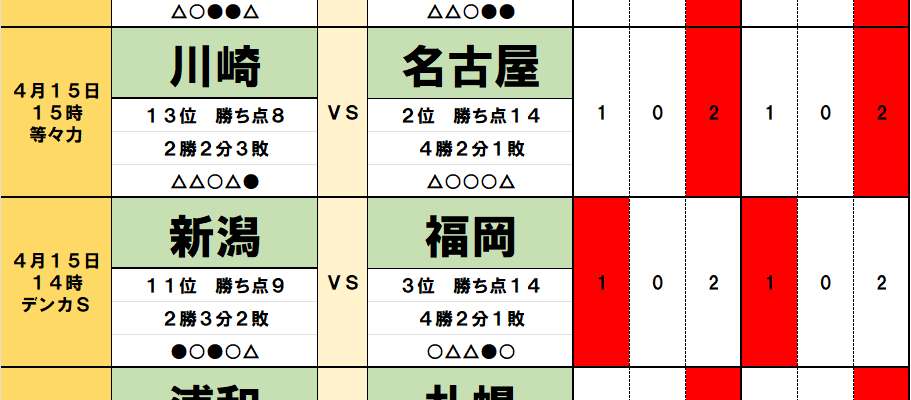 今回のtotoではJ1第8節の9試合とJ2第10節の4試合が対象となっている。過去のデータや直近の様子などから、分析を進めてみよう。