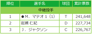 セ・リーグ:中継ぎ投手、外国人選手が三つ巴の戦いかと思いきや、中日・岩瀬が2位へ躍進も一歩届かず!激戦を制したのは、阪神・マテオ! 外野手では3位だったカープ・鈴木がトップに躍り出た!