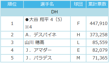 パ・リーグ:指名打者部門で日本ハム・大谷翔平が選出!遊撃手部門では、ソフトバンク・今宮が、楽天・茂木を抑え選出!最多投票者は外野手のソフトバンク・柳田の50万票越え!