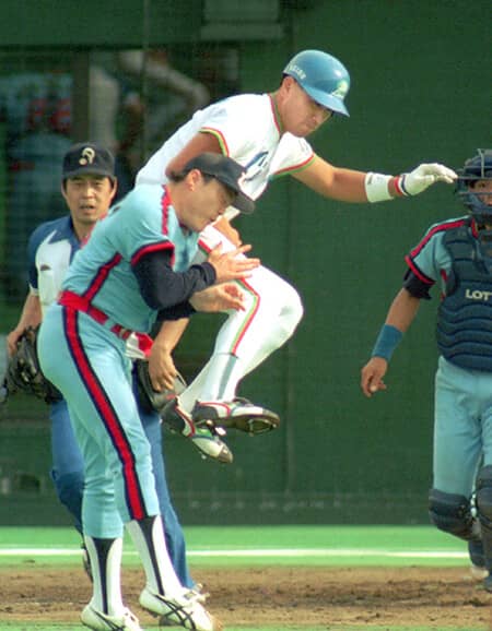 1989年、ロッテの平沼定晴(手前)から死球を受け、ヒップアタックを見舞う清原
