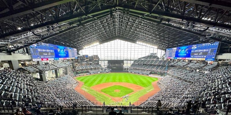 あまりにも大きな切妻屋根は屋内から見た際に屋根として認識できないほど大きく、まったく狭さを感じさせないスケール感をもっています。多層に重なる観客席はその多くが内野側に集められており、多くの飲食店も内野側コンコースにあります。来場者を見ていると大きなガラス面に正対する内野席に座って観戦する人々が多く、まるでメジャーリーグスタジアムのような雰囲気を感じます。