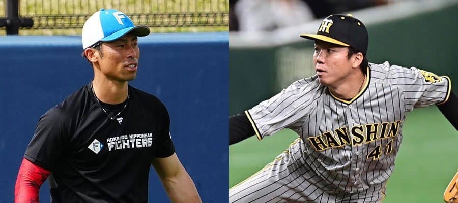 日本ハム・江越大賀(左)と阪神・村上頌樹【写真:荒川祐史、中戸川知世】