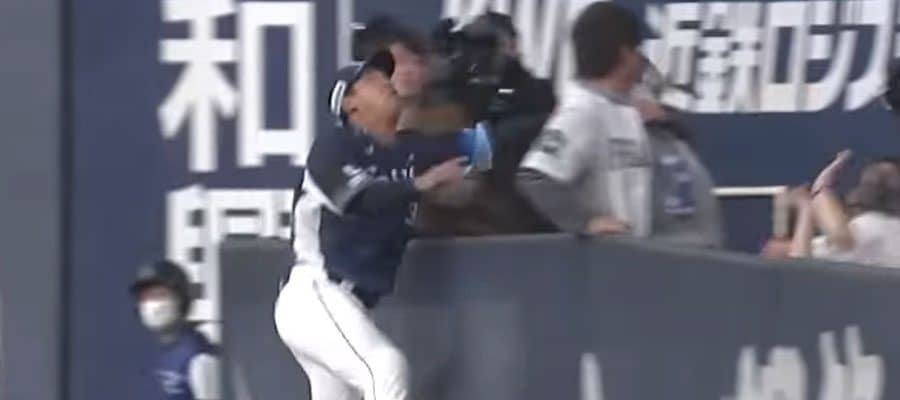 【実際の映像】フェンス恐れぬ“海老反りキャッチ”が「すっげー」 助っ人投手も大興奮…超高速守備は「忍者」