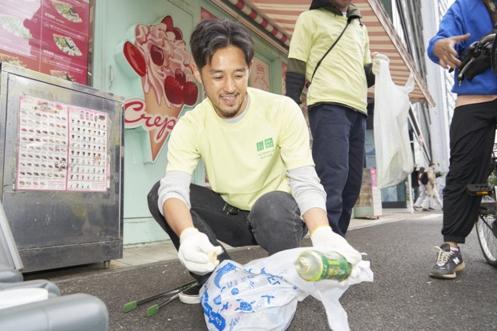 「スポGOMI×UNIQLO」は、地域の⽅々と共に⾏う社会貢献活動。2021年11⽉の京都河原町店に始まり、全国各地で開催し、1,200名以上の⽅が参加している。今回は花井さんをゲストに迎え、⼀般応募で集まった参加者65名と、ユニクロ原宿店付近で拾ったごみの量と質でポイントを競った。