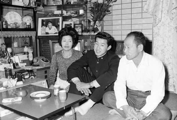 自宅で両親とともに取材を受ける、巨人に1位指名された銚子商時代の篠塚(中央)