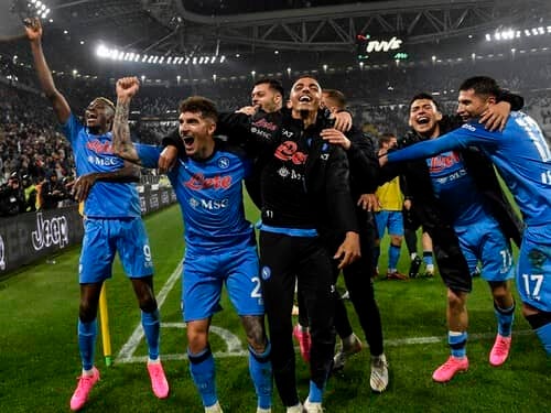 ユベントスから劇的な勝利を挙げ、喜びを爆発させるナポリの選手たち