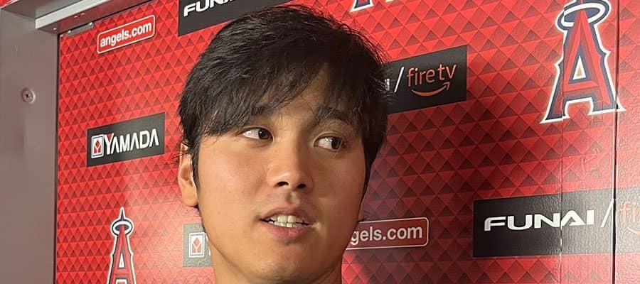 試合後の取材に応じたエンゼルス・大谷翔平【写真:小谷真弥】