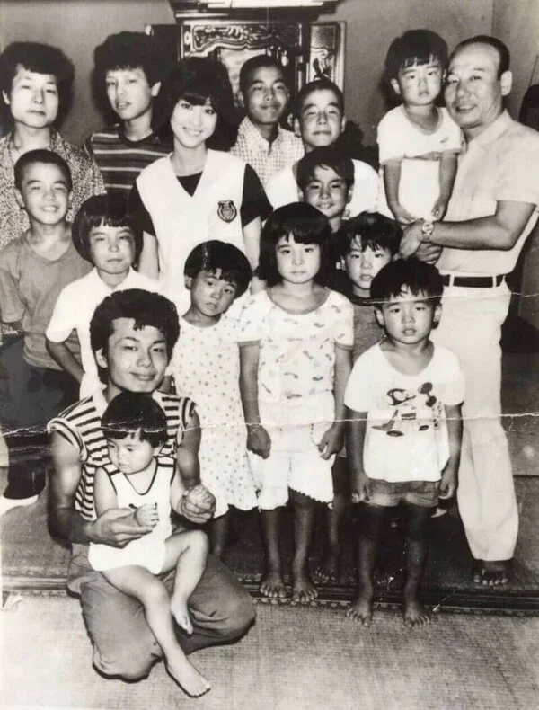 江口家の14人きょうだいと父。勝昭氏が幼い頃、テレビ番組の撮影で松田聖子が実家に訪れた