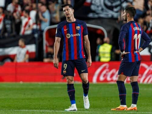 ラージョ・バジェカーノに得点され、浮かない表情のロベルト・レヴァンドフスキ(バルセロナ)