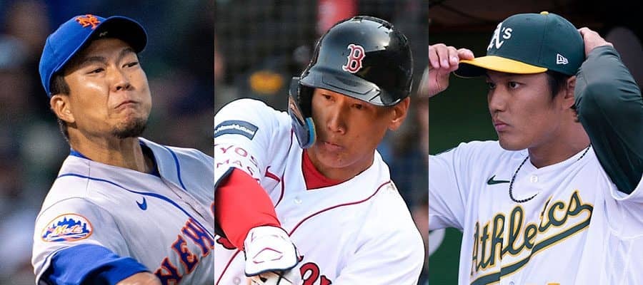 メッツ・千賀滉大、レッドソックス・吉田正尚、アスレチックス・藤浪晋太郎(左から)【写真:ロイター】