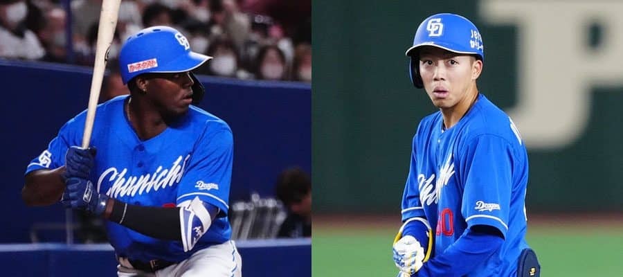 中日のアリスティディス・アキーノ(左)と岡林勇希【写真:荒川祐史】