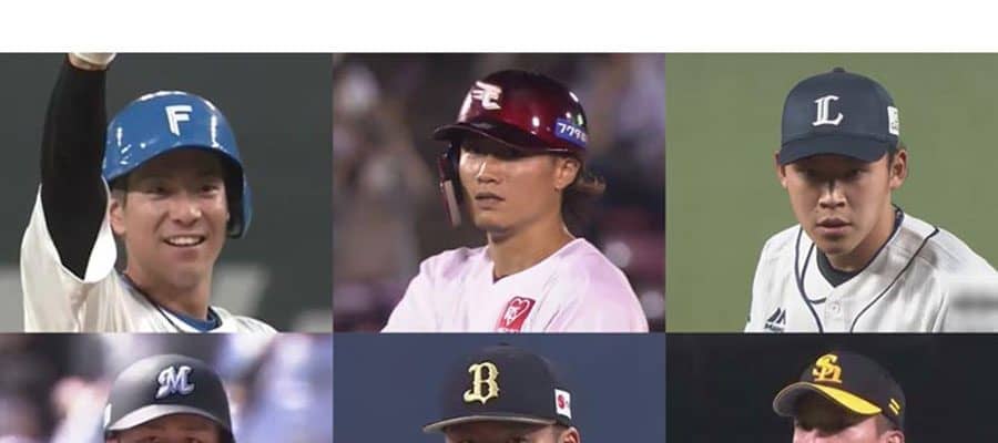 日本ハム・松本剛、楽天・西川遥輝、西武・水上由伸、ソフトバンク・東浜巨、オリックス・山本由伸、ロッテ・山口航輝(左上から時計回り)【画像:パーソル パ・リーグTV】