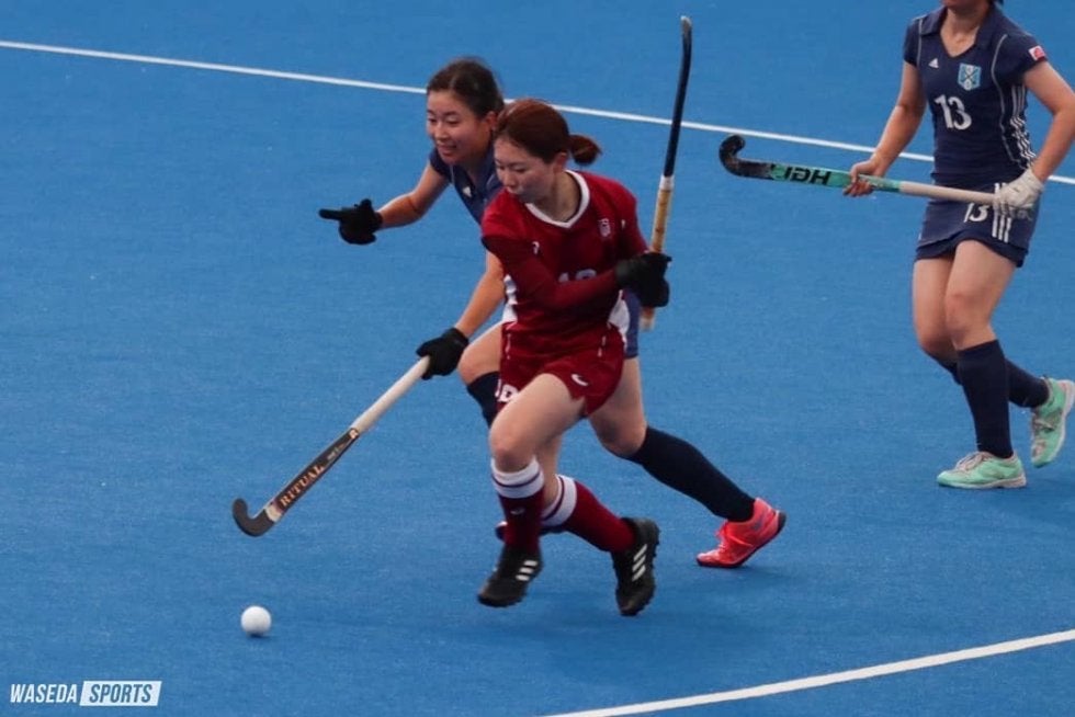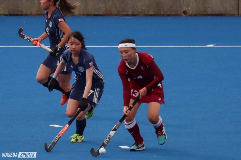 応援部を中心とした大声援がスタンドから鳴り響く中、早大ボールで試合は始まった。積極的にボールを前線へ運んだ早大は1Q4分、DF吉野真啓主将(スポ4=富山・石動) がドリブル突破からペナルティーコーナー(PC)を獲得。1度は相手GKに阻まれたものの、そのこぼれ球を安藤が押し込み早大が先制に成功した。さらに12分には右サイドから中に切り込んだFW野中ほなみ(教2=宮崎・高鍋)がゴール右隅に一閃。2Qにも8分、右サイドを突破した吉野のパスを受けたFW長谷川柚希(政経2=埼玉・早大本庄)がしっかりと決めて、1点を追加する。3点をリードし前半を折り返した。