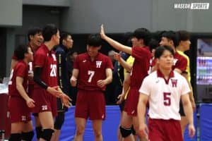 黒鷲旗全日本男女選抜(黒鷲旗)2日目、早大はV1の強豪パナソニックパンサーズ(パナソニック)と対戦した。相手の強力なサーブに押し込まれ第1セットを13―25で落とす。続く第2セットでは本来の力を発揮し、25―22でフルセットまで持ち込む。最終セットで拮抗(きっこう)した戦いを見せるも一歩及ばず、セットカウント1-2(13 -25、25-22、20-25)で敗戦した。