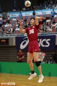 黒鷲旗全日本男女選抜(黒鷲旗)3日目、早大はグループ戦の最終カードとして、富士通カワサキレッドスピリッツ(富士通)と戦った。双方グループ戦での敗退が決まった状態での対戦であったが、富士通にこの黒鷲旗で引退を表明している選手が多いこともあり、コートには楽しみながら明るく送り出す空気が満ちていた。序盤から早大のペースで進み、セット後半には下級生も多く出場機会を得た。グループ戦突破とはならなかったものの、Vリーグのチームと戦う貴重な経験を積んだ早大。セットカウント2-0(25-17、25-17)で勝利し、グループ3位で大会を終えた。