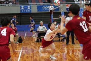 第1セットはリベロ荒尾怜音(スポ4=熊本・鎮西)の綺麗なキャッチから、MB伊藤吏玖副将(スポ4=東京・駿台学園)のクイックにつながり先制。OH水町泰杜主将(スポ4=熊本・鎮西)のノータッチサービスエースもあり上々な滑り出しとなったが、両チームにサーブミスが続き乗りきれない。ここで、相手の伸びたレシーブを水町がダイレクトに叩くと思いきや、セッター前田凌吾(スポ2=大阪・清風)へパス。前田が再び水町に戻し、クロスに決める鮮やかなプレーでチームを勢いづけた。中盤以降はどこからでも打てるMB麻野堅斗(スポ1=京都・東山)のクイックやOH山田大貴(スポ4=静岡。清水桜が丘)の鋭いスパイク、OP畑虎太郎(スポ2=福井工大福井)のブロックなどで点を重ねる。大幅にリードして後半に差し掛かると、馬渕純(スポ3=岐阜商)らがコートに送られた。リベロ布台駿(社4=東京・早実)の二段トスから水町が決め23-15。また、ミスにはなったものの、馬渕と菅原啓(教1=山形南)のコンビも見られ、今後に期待が高まる。最後は麻野のブロックポイントでセットを奪った。