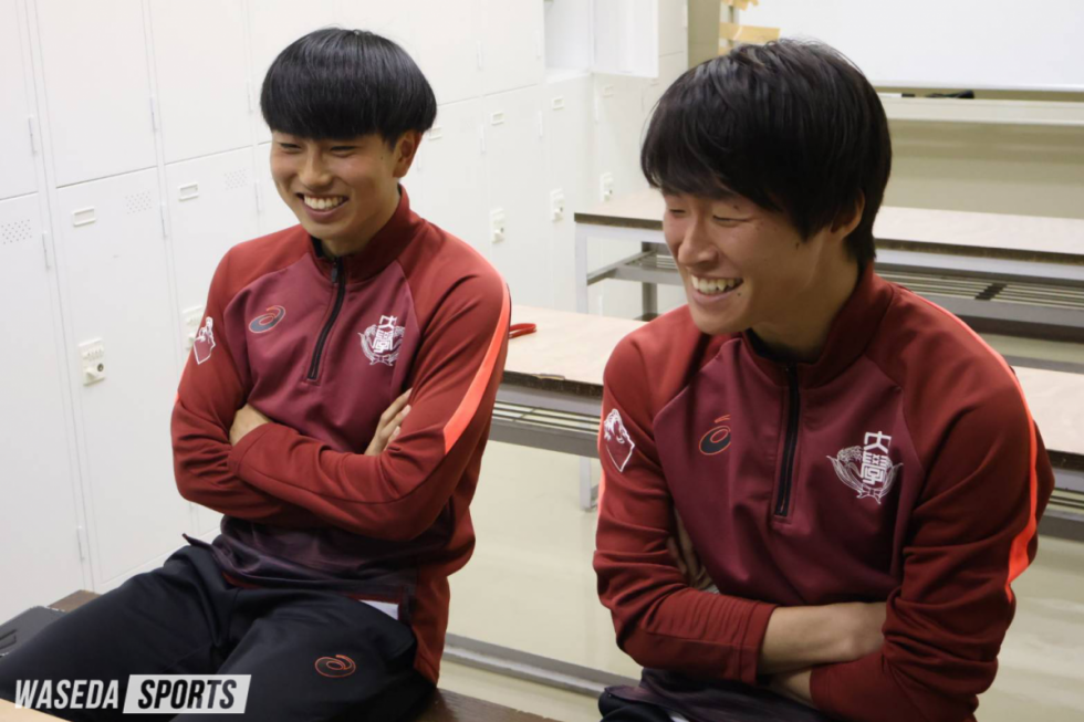 近年のサッカー界において重要とされている役割が、自チームや他チームを客観的に分析し弱点を洗い出すアナライズの部分。強豪と呼ばれているクラブの多くが、このアナライズに力を入れている。大学サッカー界においても、アナライズは重要視されており、早稲田大学ア式蹴球部(ア式)にももちろんアナライズ担当が存在している。その中で今回は、選手として活躍しつつ、アナライズチームのリーダー的存在でもある、MF福井寿俊(文構4=東京・国学院久我山)とDF藤本隼斗(スポ4=柏レイソルU18)のお二人に対談をしていただき、アナライズチームの役割や、今季のア式が掲げているサッカー。加えて、選手としての自分のことやプライベートのなどさまざまなことを伺いました。後編ではアナライズチームリーダーとしての役割、お二人の今季にかける思いなどを話していただきました!
