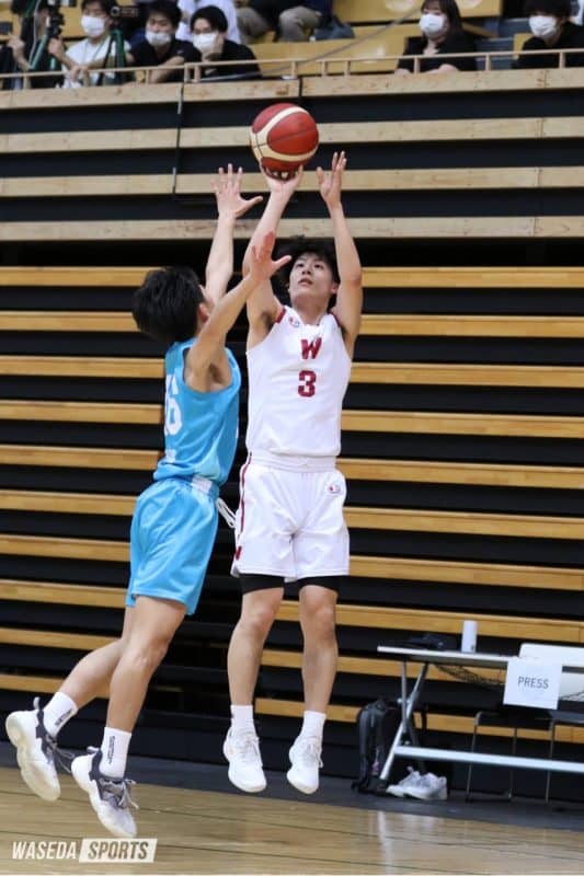 第1Qの序盤、相手に5連続ポイントを許し、苦しい立ち上がりとなる。その後も差を縮められず7-12となり、新戦力であるG下山瑛司(スポ1=愛知・中部第一)、G城戸賢心(スポ1=福岡第一)、F三浦健一(スポ1=京都・洛南)をコートに投入する。苦しい場面でF星川堅信(スポ4=京都・洛南)がスリーポイントを決め、徐々に早大のペースを取り戻し、18-18と同点まで追い上げる。しかし、相手のスリーポイントが決まり、30-37と点差を引き離され、試合を折り返した。