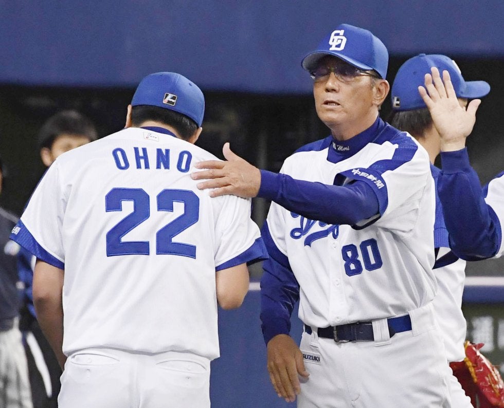 中日―阪神 2勝目を挙げた大野(左)を迎える中日・森監督=ナゴヤドーム【写真提供:共同通信社】 中日が2対0で阪神に勝…
