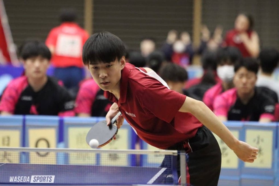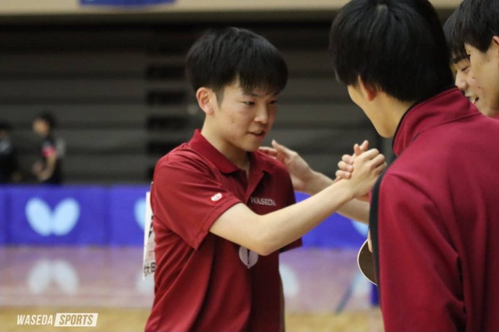 3番手、昨年度も活躍を見せた濵田一輝(スポ2=愛知・愛工大名電)が登場する。第1ゲームでは両者譲らない中、先にマッチポイントを迎えた相手に11ー9で逃げ切られるが、第2、3ゲームでは圧倒的なスピード感で流れを自分のものとした濵田が勝利を収める。このままの流れで勝ち切るかと思われたが、第4ゲームを奪取され最終ゲームまでもつれる激戦に。最終ゲームでは序盤から点差を広げられると、濵田は攻撃を仕掛けるものの完全に決め切ることができず11ー6で敗北。エースが敗れるまさかの展開となった。ダブルスには、濵田と関東学生新人選手権で単複優勝を収めた徳田幹太(スポ1=山口・野田学園)組が挑んだ。2人は息の合ったプレーで確実に点を重ねていく。それぞれが強打で相手を翻弄(ほんろう)し3ー0でストレート勝ちを決めた。