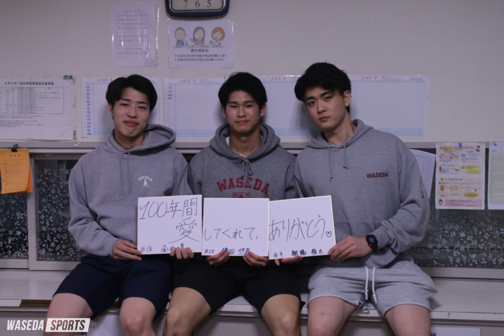 色紙には創部100周年への感謝を綴りました。左から、金井、鎌田、棚橋