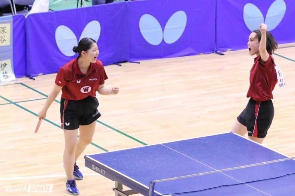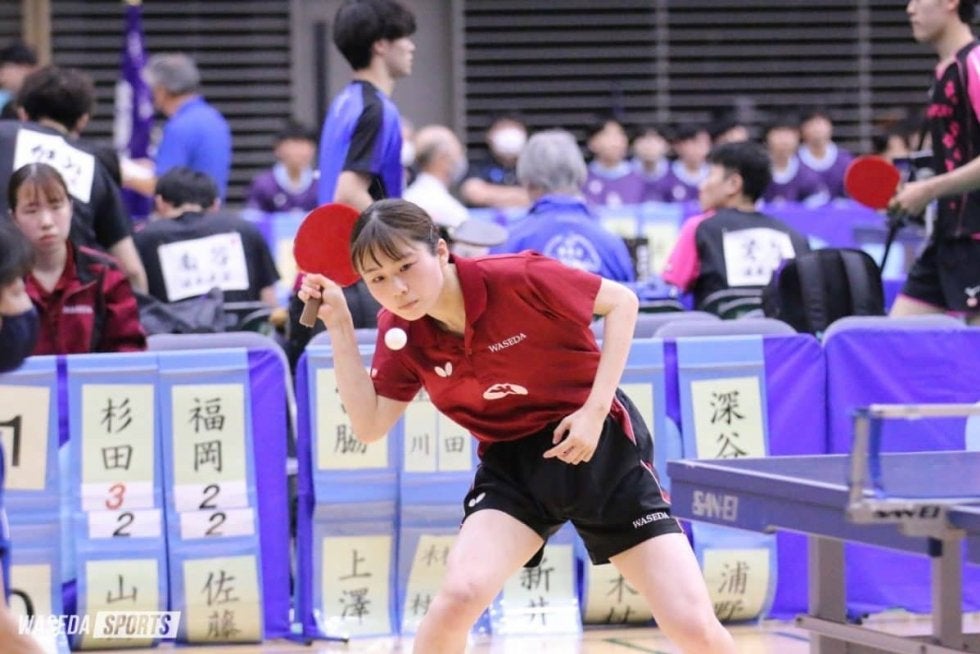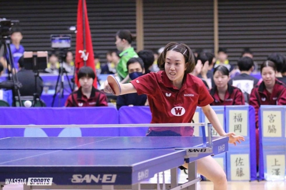 前日に続き、1番として登場したのは杉田。ゲームカウント1-2と、後がない状況で第4ゲームを迎えた。序盤から2点のリードを許し、逆転できないまま終盤へ。さらに、相手のサービスエースで7-10でマッチポイントを握られる。しかし、ここから攻撃が決まり、そのまま5連続得点で12-10とした。最終ゲームは序盤から競り合う展開となる。それでも、両ハンドの強烈な攻撃で点数を重ね、11-6で接戦をものにした。2番・福岡の試合も2ゲームずつを取り合い、最終ゲームへと突入した。2-5からの連続得点で追いつくと、その後3球目攻撃やコースを突いたドライブなどが決まり、マッチポイント。最後はサービスエースで11点目を奪い、フルゲームにもつれる試合を勝ち切った。3番・宮脇心和子(社2=鳥取敬愛)はゲームカウント3-0で勝利。続くダブルスのゲーム途中で相手が負傷し棄権したため、早大のストレート勝ちが決まった。