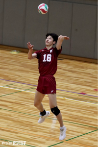 第1セットは「2連戦の次の日というのは(入り方が)難しい」(リベロ布台駿(社4=東京・早実))というように、守備範囲の間を突く相手のサービスエースなどで、いきなり4連続得点を許す。しかし、ここで前衛のOP畑虎太郎(スポ2=福井工大福井)が止まらない。インナーへの鋭いスパイクやブロックなどで多くの得点に絡み、10―7とした。甲斐孝太郎(専大)の強力なサーブが回ってきた際は、早大はやや崩されながらも強引にいかず、OH山田大貴(スポ4=静岡・清水桜が丘)が軟打で返すなど落ち着いたプレーを見せる。一方相手はアタックミスが多くなり、20-14と早大リード。25点目はMB伊藤吏玖副将(スポ4=東京・駿台学園)のクイックで奪った。
