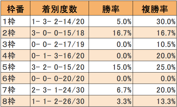 過去10年の枠順別成績は以下の通り。