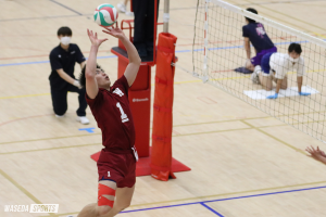 春季関東大学リーグ戦(春季リーグ戦)第10戦は東海大との対戦。第1セットは圧倒的な攻撃力で奪取した。以降、細かいミスが出はじめたが、大きく崩れないのが今年の早大。第3セットは24―23まで追い上げられたものの、デュースには持ち込ませず逃げ切り、セットカウント3―0(25―19、25―21、25―23)で勝利した。