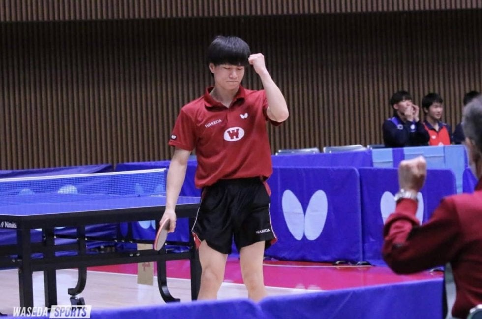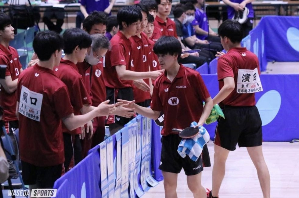 2点を先取され押される展開となったが、ここから早大の反撃が始まる。3番手の杉本和也主将(スポ4=福岡・希望が丘)は第3ゲームを落とすものの、攻めの姿勢を崩さずプレーを続ける。レシーブからチキータを繰り出し反撃を防ぐことで得点に結びつけ、最後は長いデュースを粘り強く勝ち切り16ー14で試合終了とした。続くダブルスでは落とすことができない最終ゲームで濵田・徳田幹太(スポ1=山口・野田学園)組の強さが際立つ。徳田のサーブで相手に緩いレシーブを誘い、濵田のチキータで得点を決める。息の合ったプレーでピンチを切り抜き最終ゲームをものにした。徳田は続くシングルスでもラリーでの技巧が光るなど安定したプレーを見せ、危なげなくストレート勝利を収める。