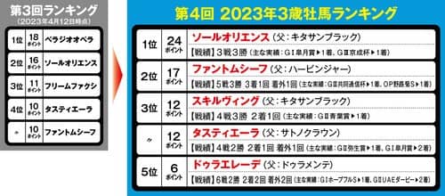1位は、皐月賞で超絶なパフォーマンスを披露したソールオリエンス。24ポイントを獲得して、前回の2位からついに首位に立った。このまま、史上最少キャリアでの二冠達成となるのか、大いに注目される。