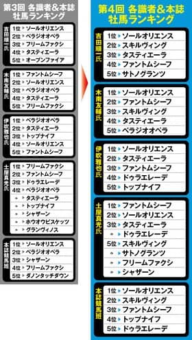 ※『Sportivaオリジナル番付』とは、デイリー馬三郎の吉田順一記者、日刊スポーツの木南友輔記者、JRAのホームページでも重賞データ分析を寄稿する競馬評論家の伊吹雅也氏、フリーライターの土屋真光氏、Sportiva編集部競馬班の5者それぞれが、まもなく行なわれる日本ダービーに臨む3歳牡馬の実力・能力を分析しランク付け。さらに、そのランキングの1位を5点、2位を4点、3位を3点、4位を2点、5位を1点として、総合ポイントを集計したもの。