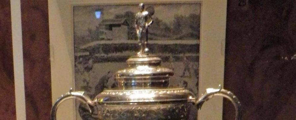 1882年にデザインされた初代ワールドカップ(もちろんレプリカ)。ボールを足元に置いた選手がつけられた「フタ」、純銀製の「カップ」、そして木製の台座からなる。このスタイルが大会形式とともに世界に広まった (c)Y.Osumi