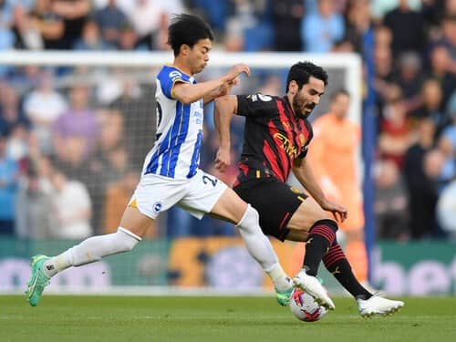 マンチェスター・シティはレアル・マドリードと戦ったCL準決勝第2戦から先発メンバーを4人入れ替えてきた。ブライトンよりベストメンバー度では弱冠劣った。だが、それでもアーリング・ハーランドはいた。ベルナルド・シウバもケヴィン・デ・ブライネもイルカイ・ギュンドアンもいた。カイル・ウォーカーも三笘薫の目の前でしっかりと構えていた。
