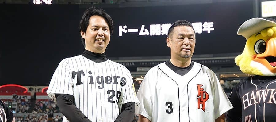 ソフトバンクは27日、本拠地でのロッテ戦を、球団創設85周年とPayPayドーム開業35周年を記念した「ダブルアニバーサリーデー」として実施。試合前には平成で唯一の3冠王を獲得した球団OBの松中信彦氏と、阪神のエースとして活躍した井川慶氏が“1打席対決”を行った。松中氏は「久しぶりに『信彦コール』をもらえて、現役時代を思い出して楽しかったです」と汗を拭った。