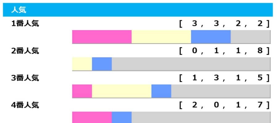 3番人気は【1.3.1.5】勝率10.0%、連対率40.0%、複勝率50.0%とまずまずの成績。しかし2020年にグランアレグリアが優勝して以降、2年連続で馬券外に沈んでいる。