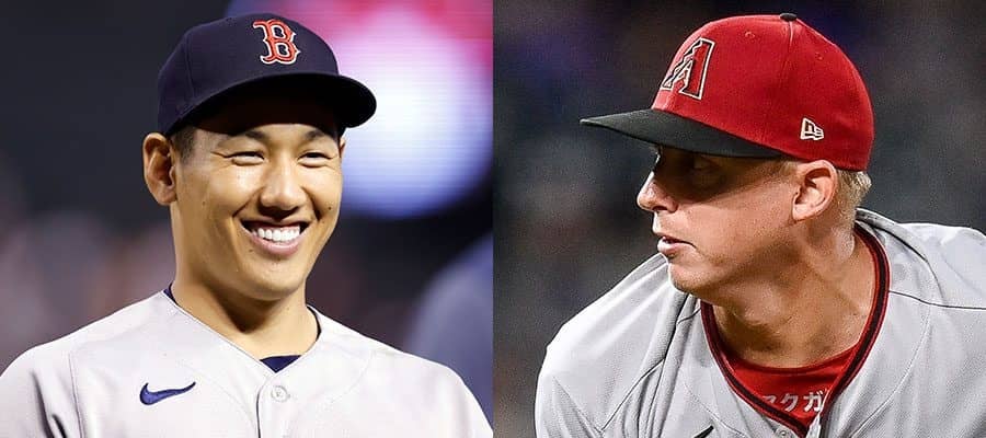 レッドソックスの吉田正尚(左)とダイヤモンドバックスのスコット・マクガフ【写真:Getty Images】