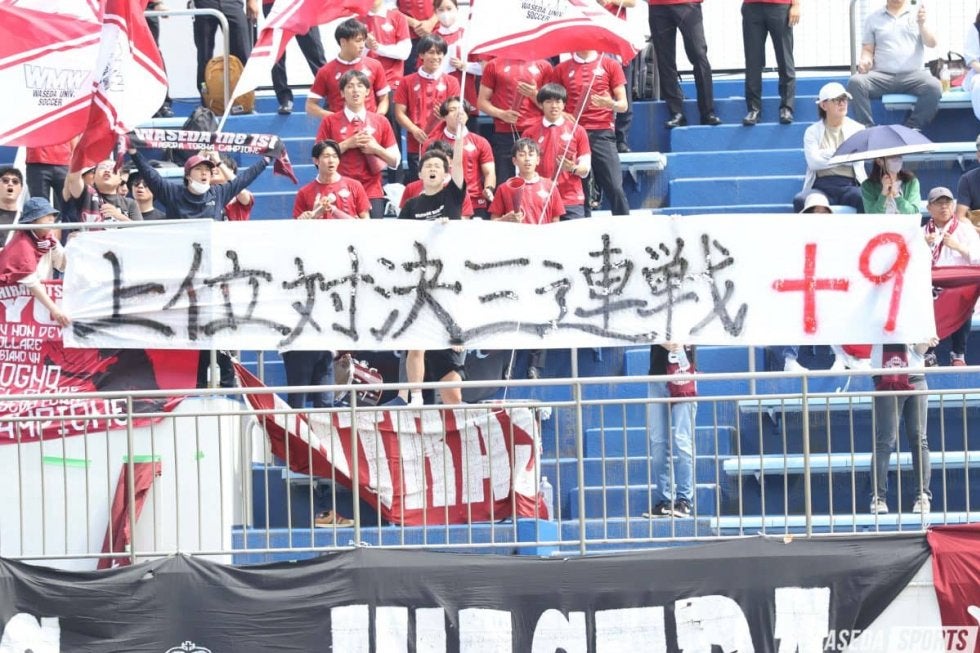 試合前に掲げられた横断幕。上位との連戦が続く中、1でも多く勝ち点を積み上げたい