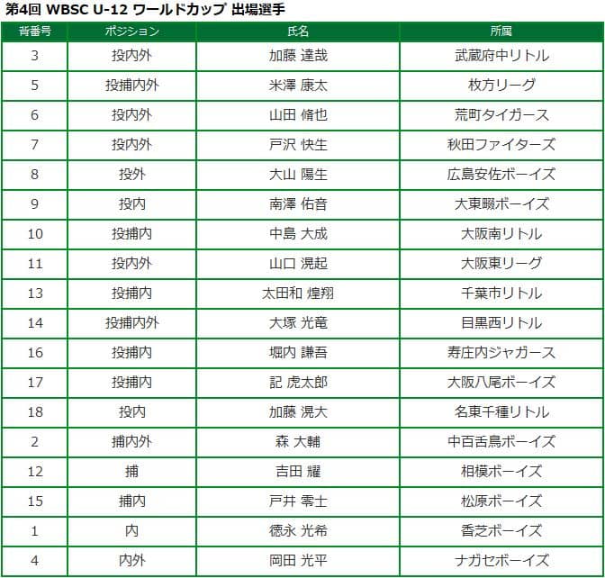 7月28日から台湾で開催される第4回WBSC U-12(12歳以下)ワールドカップに出場する侍ジャパン18選手が発表された。