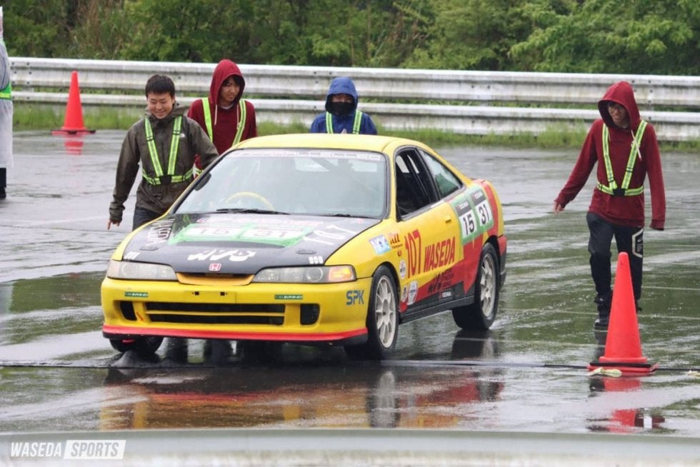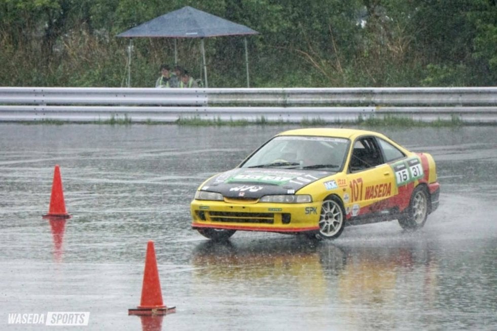 終日雨に見舞われた静岡・富士スピードウェイで、全関東学生ジムカーナ選手権(全関東ジムカーナ)が開催された。早大自動車部からは大矢根洋(文3=東京・和光)、宮崎拓郎(法3=富山・高岡)、小林眞緒(創理4=福岡雙葉)、近藤怜(先理4=岐阜)の4名が完全なウェット路面となったコースを走り抜けた。最終的に男子の部では団体5位に、女子の部では小林が個人2位という結果に終わった。